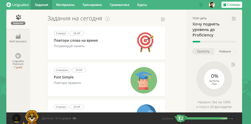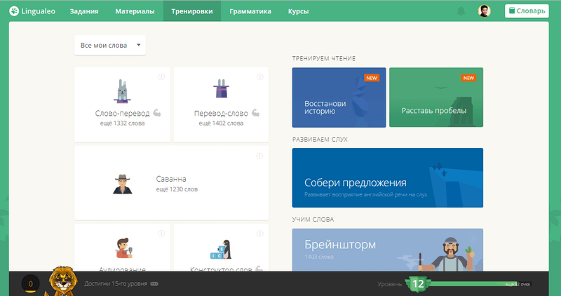 Разобрать в сервисе помогает львенок Лео . Он объясняет, с чего начать и как тут все устроено. Львенка нужно “кормить”, зарабатывая очки опыта – их дают за выполнение любых заданий на сайте. Очки нужны, чтобы снять некоторые ограничения. К примеру, часть упражнений на заучивание слов открывается после прокачки до определенного уровня.
