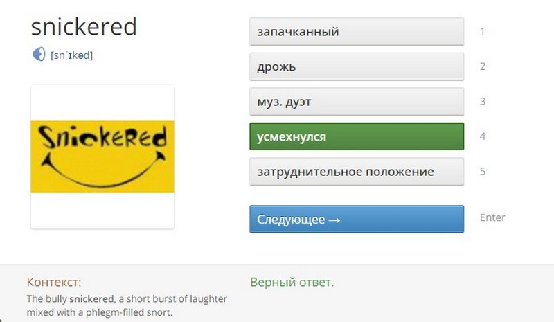 - Слово-перевод — традиционный «множественный выбор». Вы видите слово на английском, к нему дается несколько вариантов русскоязычного перевода. Вам нужно выбрать правильный ответ. Имейте в виду, что к слову дается контекст и картинка.
