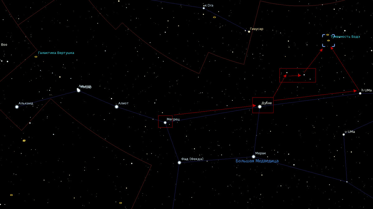 Наверное, самые ключевые объекты для наблюдения в созвездии Большой Медведицы. Во-первых, их не сложно найти; во-вторых, оба имеют доступную звёздную величину для наблюдения даже в любительские телескопы: 6,9 m и 8,4 m соответственно; в-третьих, при непосредственной близости друг возле друга на небольшом увеличении их можно увидеть одновременно в объективе телескопа, примерно, как показано на фотографии выше. Примерный маршрут для поиска показан ниже: